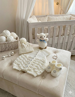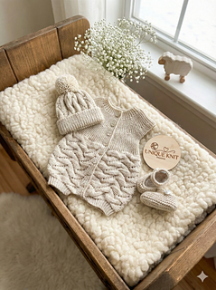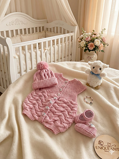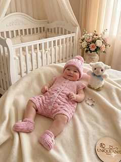 Sideways knitted romper suit set. The romper is knitted sideways using short rows and requires minimal sewing, just the gusset to sew up