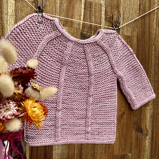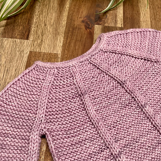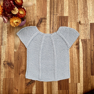 This top is worked from the top down in the round and is knit in garter stitch with slipped stitch columns.
