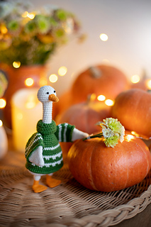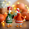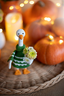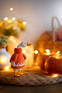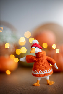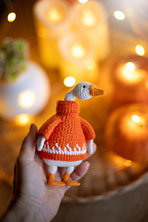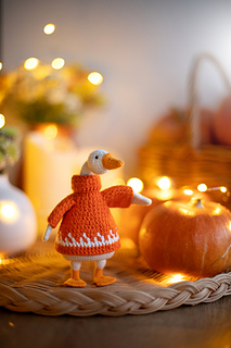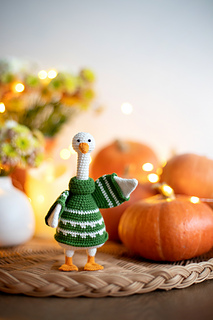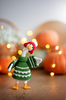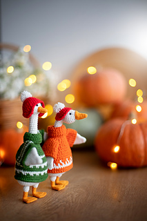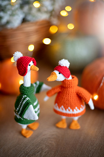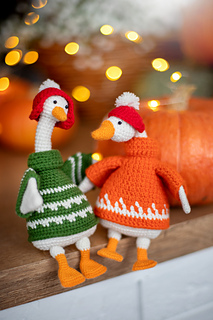 I created a pattern for two wonderful geese that are slightly different in appearance. One goose is crocheted directly into the sweater, while the other is crocheted separately from the sweater, and I also created a sweater pattern for it. Additionally, I created two hats with pompoms.
