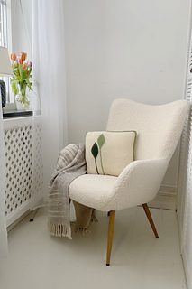 18 sts x 38 rows = 10 x 10 cm in garter stitch, measured before blocking. Gauge is not crucial, but will affect yardage and size of the cushion.