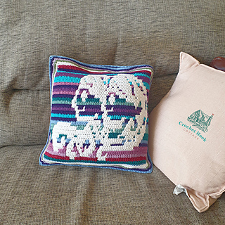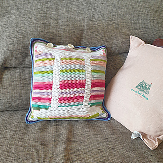 Any yarn weight or brand can be used to crochet this cushion cover - when made with DK weight yarn, the cushion cover, with both pieces joined together, measures approximately 40 cm square (16 inches square). The amount of yarn used (DK weight yarn) is approximately 432 grams (16 ounces) or 648 metres (710 yards); with the main colour requiring 252 grams (9 ounces) or 378 metres (414 yards); and the contrast colour using 180 grams (7 ounces) or 270 metres (296 yards).