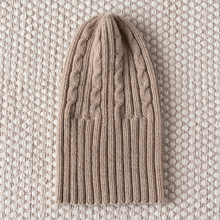 The Gentle Breeze Hat is knit in the round from the bottom up with DK-weight merino wool. The design features a combination of ribbing and simple cables. The pattern is an 8-round repeat. The hat is very stretchy.