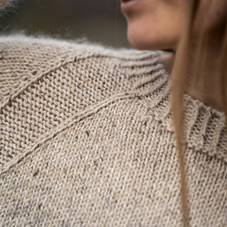 Its defined raglan lines emerge discreetly from the neckline rib, continue over the shoulders, and run down along the body to the finishing rib edge. The stockinette stitch allows the material to stand out, while the ribbed edges at the neck, sleeves, and body bring the design together in a simple and harmonious finish.