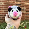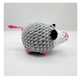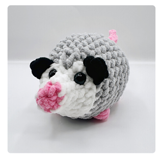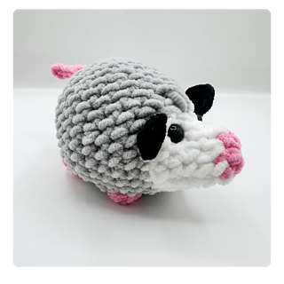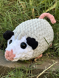 The opossum in the pictures was created using weight 5 (super bulky) yarn and a 4.5 mm hook. It is approximately 8” long. You can use any weight of yarn and an appropriate hook, but the plushie may be smaller or larger.