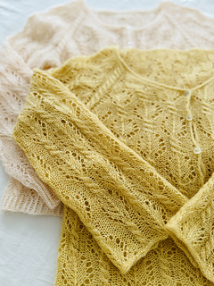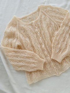 The cardigan is worked as a classic raglan design from the top down. First, the yoke is shaped with classic raglan increases along the raglan cables. To shape the round neck, the first few centimeters are worked with additional increases along the front panels for the neckline. When the round neck shaping is finished, the cardigan is worked in cable-lace-pattern with raglan increases along the raglan cables only. Then, the sleeves are separated from the body and the stitches are put on hold on a separate rope or leftover yarn. The body is now finished in cable-lace-pattern without increases and finished off with a hem in 1x1 twisted ribbing. Now, the sleeve stitches are picked up again and the sleeves are finished in the round in cable-lace-pattern. Shortly before the cuffs, you will work a bunch of decreases for a balloon-like sleeve shape. The cuffs are then worked in 1x1 twisted ribbing matching the body hem. Last, but not least, stitches are picked up along the neckline to work a collar in double knitting and then, the front parts are finished off with a double knitted button band as well.