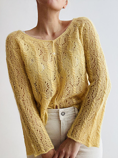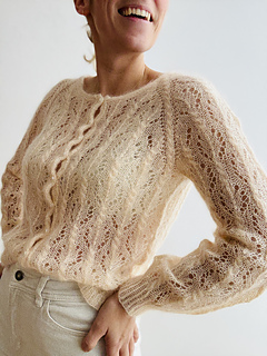 The fit of the cardigan is slightly oversized due to relatively small amount of positive ease (5 to 15 cm). The length is relatively short, but of course it can be adapted due to the individual body shape and preferences as the cardigan is worked top down and can be tried on during the process. The highlight of the design is the intricated cable-lace-pattern, which flows out of the raglan lines and creates a sophisticated, elegant and timeless look with a special twist!
