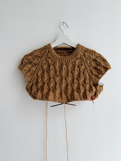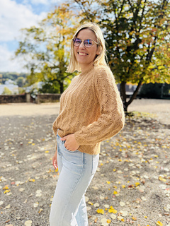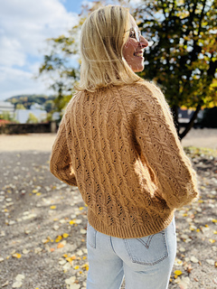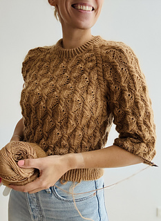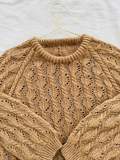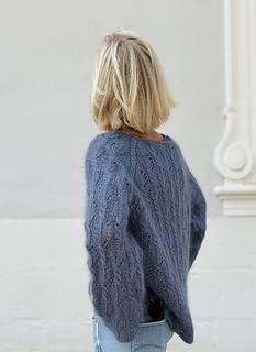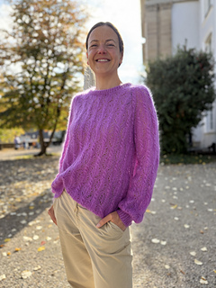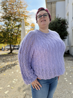 The fit of the sweater is relatively oversized with a larger amount of positive ease: 20 to 30 cm depending on individual preferences and the size you are working. The length is relatively short, but of course it can be adapted due to the individual body shape and preferences as the sweater is worked top down and can be tried on during the process. The highlight of the design is the intricated cable-lace-pattern, which flows out of the raglan lines and creates a sophisticated, elegant and timeless look with a special twist!