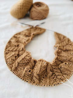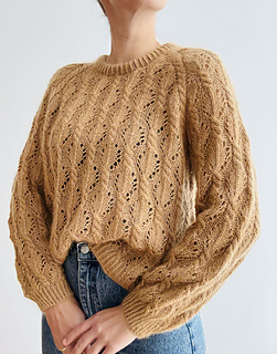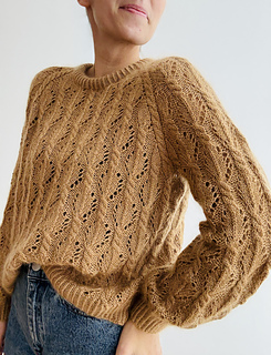 The sweater is worked as a classic raglan design from the top down. First, the yoke is shaped with classic raglan increases along the raglan cables. To shape the round neck, the first few centimeters are worked back and forth in rows in lace and in cable pattern and with additional increases along the front panels for the neckline. When the front panels are joined to the round, the sweater is worked in cable-lace-pattern in the round with raglan increases along the raglan cables only. Then, the sleeves are separated from the body and the stitches are put on hold on a separate rope or leftover yarn. The body is now finished in cable-lace-pattern without increases and finished off with a hem in 1x1 half twisted ribbing. Now, the sleeve stitches are picked up again and the sleeves are finished in the round in cable-lace-pattern. Shortly before the cuffs, you will work a bunch of decreases for a balloon-like sleeve shape. The cuffs are then worked in 1x1 twisted ribbing matching the body hem. Last, but not least, stitches are picked up along the neckline and a double folded collar in 1x1 half twisted ribbing is added to the sweater.