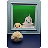 A small crochet chick standing with its back to the camera and in front of a mirror. In the mirror we can see the chick's front, and next to it a tall ghostly chicken, also crocheted.