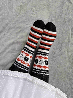Ghostie-sukat saavat jatkoa nyt aikuisen koossa. Ghostie sukat ovat kirjoneulesukat, joissa on yksi aikuisen koko, noin 38-40. Jalkaosa on raidallinen ja muunneltavissa; raitojen johdosta voit neuloa sitä sopivaksi omaan jalkaan. Näihin sukkiin upotat muuten jämälangat kivasti: tarvitset kolme väriä: valkoinen noin 40-50 g, musta noin 70-80 g ja ruskea noin 15-20 g. Kirjoneuleosiossa on kahta lankaa kerrallaan.