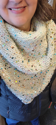 This shawl is knit from the bottom up. It is a simple 1 row repeat that allows the Sutton Glitz and the Tiny Loops to shine. It has an optional applied icord that gives the shawl a more finished look.