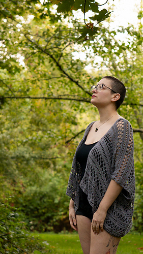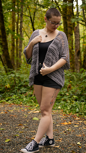 Sample was made with HiKoo Popcycle (50% Bamboo, 50% Polyester from Recycled Bottles, 305 yards per 100 gram hank). Sample uses 4 hanks total in color#3023-Clouded. This pattern includes instructions for a single color version but can easily be completed using multiple colors (striping, color-blocking, etc). Please note, depending on your wingspan measurements, you may need less or more yardage.