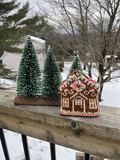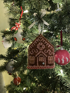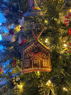 The gingerbread house ornament starts with Judy’s magic cast then a latvian braid is worked and the rest is stranded colorwork worked in the round to create a two sided house. An icord is worked to make a hanging loop.