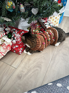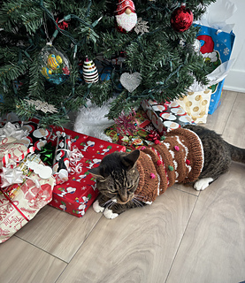 This gingerbread man inspired pet (dog or cat) sweater is knit in the round seamlessly from the top down. It features white frosting and candy cane designs throughout. Fair Isle stranding is used and no more than two contrasting colors at a time.