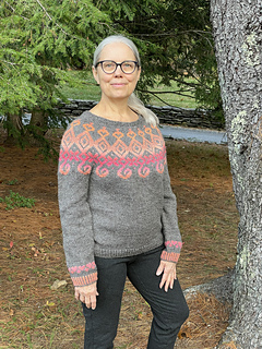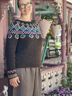 The gingerbread cottages in Oak Bluffs on the island of Martha’s Vineyard feel uniquely like home to me. Since birth, I’ve spent time in this special place where people gather to form a community of diverse experiences and perspectives. Generations of families have passed down cherished traditions here, summer after summer, including crafting. To capture the essence of place, with both nostalgia and hope for the future, I designed Gingerbread Whimsy, a top-down, seamlessly constructed yoke sweater with optional short row shaping at the neck and an optional high-low hem at the bottom. Yoke colorwork motif is charted.
