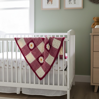 Pretty gingham baby blanket with daisy motifs. The finished measurement is approximately 75 x 75 cm. Options for 3 different colour ways are included, Silver, Rose and Denim Gingham.