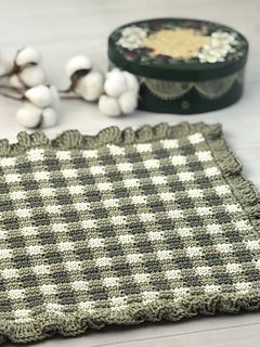 Crochet gingham placemat pattern, gingham design #702 for an easy DIY crochet table accessory project that makes an attractive and classic gingham checkered design table setting mat. The placemat with yarn suggested makes a dependable yet soft and intricate rectangular shaped place setting mat. You can make a set to use for your home or give as a fun gift for friends or family members. The pattern is designed to make three-tone gingham mats and has yarn suggested for green, pink and red versions (see photos). A color-coded body pattern chart is included for easy visual creation.