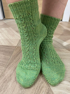 The classic eyelet stitches are easy to remember and would look great knitted in a variety of sock yarn colors. The construction is cuffed down using the magic loop technique.