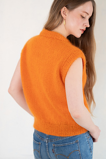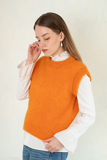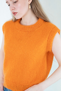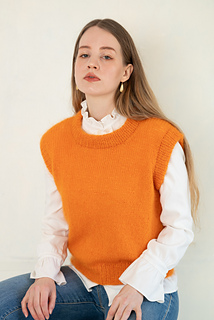 CONSTRUCTION: This classic slipover is designed to be knitted from the top down, with no seaming required. The construction starts with short rows shaping the back to define the shoulders. Stitches are then picked up along the back shoulder edges and shaped toward the neckline. The front shoulders are joined seamlessly at the neckline and worked down to the underarm, where the front and back are joined to continue in the round to the hem. Finally, the neckband and the armholes are worked in ribbing and folded for a polished finish.