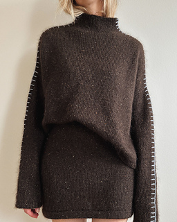 The skirt is worked from the top down. First, stitches are cast on using a provisional cast-on. A waistband is knitted, and then an elastic band is inserted at the waist. The skirt is first shaped with Japanese short rows (fully explained in the pattern), while side increases are initiated. Next the skirt is worked in the round on circular needles, with increases. The hem is finished with a double-folded edge. Finally, the decorative seams are sewn along both sides of the skirt.