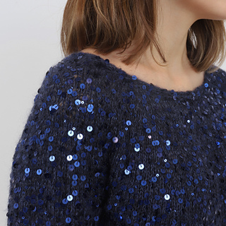 Glitrós is knitted in the round, in stockinette stitch. What makes it fun are the sequins that decorate it. The ribbing at the bottom of the body and sleeves, as well as the neckline, is worked in seed stitch.