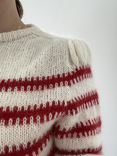 Modellen er tætsiddende og ret enkelt at strikke. Den strikkes med 2 forskelliger udtagninger, hvor der laves skulderudtagninger først, dernæst laves puff på skuldrene samtidig med at der laves ærmeudtagninger.