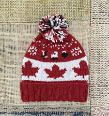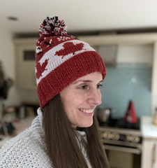 I LOVE everything Winter Olympics – this is a tribute to both Team Canada and more broadly to winter sports. It’s designed with a stretchy brim in double rib that you fold up and uses DK yarn.