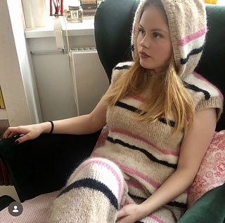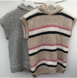 The sleeveless hoodie is knitted from the bottom up and worked in the round on circular needles. The work is separated from the sleeve gap, and worked back and forth. The bottom rib band has slits on either side, so ribbing for back and front pieces are worked separately and gathered in the round afterwards. The hood is shaped at the top with decreases and short rows.