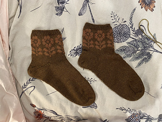 The socks are knit top down on 2.25 mm (US 1) needles with a short ribbing section before starting the colorwork pattern. The colorwork pattern is provided as a chart.