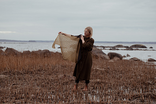 This shawl is knitted from the pointed end to the straight upper side. It begins with a provisional cast-on to create a continuous i-cord edge. The first part is worked in garter stitch stripes, using C1 and C2. The rest of the shawl is knitted in C3, with garter stitch on the left side and a lace pattern on the right side.
