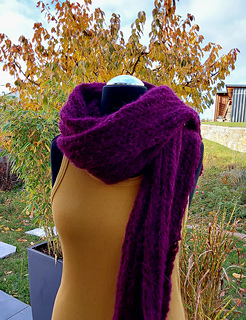My bordeaux Goldberg Shawl measures 25 x 250 m (100 g yarn used)
