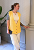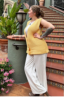The Golden Hour Vest is worked in three pieces: a back panel and two front panels that come together to form a sleek, blazer-inspired silhouette. The vest has a comfortable length and a deep V neckline, making it versatile for both work and casual wear. Layer it over a crisp button-up for a polished office look, or dress it down with a tube top or crop top for something more relaxed.