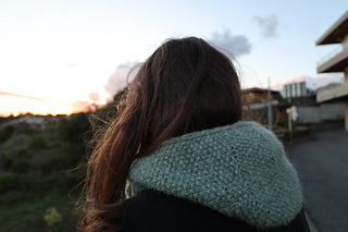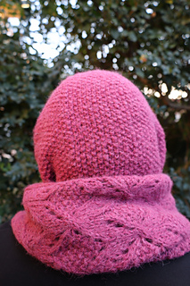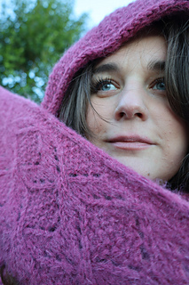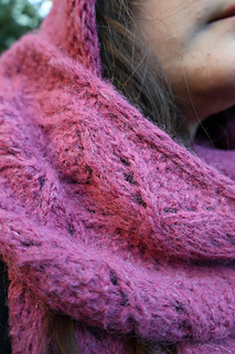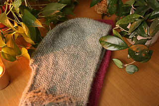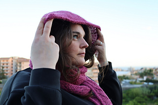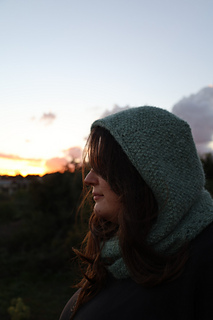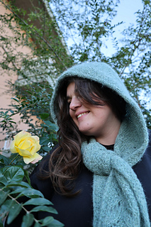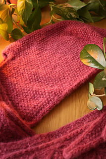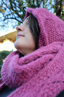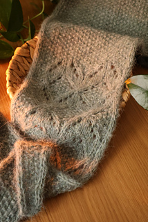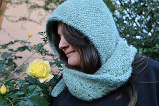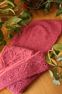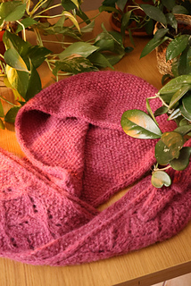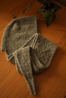 The Good Winds Hood is a seamless, flat-knit hooded scarf worked in sequential sections. It begins with a seed-stitch rectangle that forms the top of the hood, with stitches picked up along one edge to shape the hood. The hood is worked in seed stitch to the desired length, then divided to create two scarf panels. An applied i-cord runs along the front edge of the hood and continues down the scarf edges, giving a neat, built-in finish. Each scarf panel begins in seed stitch before transitioning into a lace pattern, tapering gradually with even decreases for a soft, elegant drape.