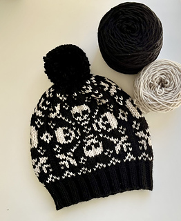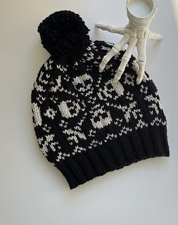 This slouchy beanie is a toasty, thick, colourwork project featuring skulls and decorative fair isle elements. It’s a fun hat for Spooky Season or when you want to don some skulls and are more punk rock than cutesy.