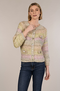 Short raglan cardigan with jewel neck and ¾-length sleeves. Yoke is worked from the top down, with raglan shaping and German short-row shaping for the back neck. Sleeves are divided from yoke and placed on hold while body is worked to the hem. Then sleeves are worked in rows to the cuff. The cardigan is worked in reverse Stockinette stitch with ornamental welt pockets.