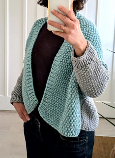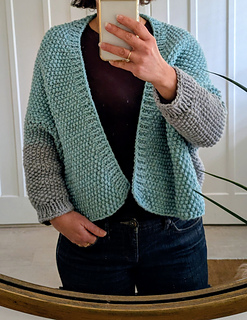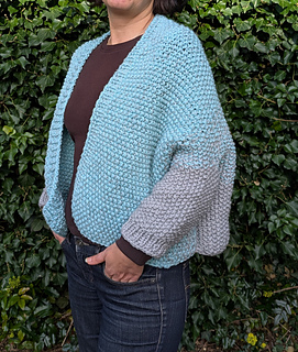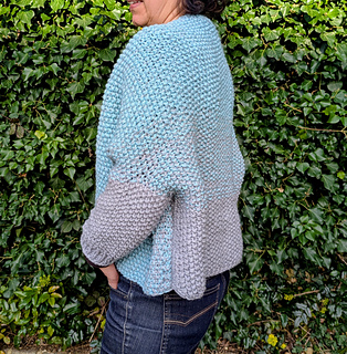 This textured seed stitch cardigan knitting pattern uses two strands of yarn held together, gradually changing colors to create a soft, natural gradient effect.