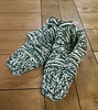 Grandma’s Bedsocks are worked flat using two strands of worsted weight yarn held together. The size can be adjusted to fit different foot sizes using a single strand of chunky or extra bulky yarn instead of two held together. The slippers are seamed down the back of the heel and up the top of the foot.