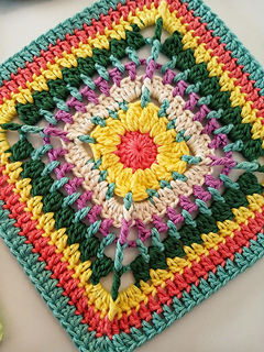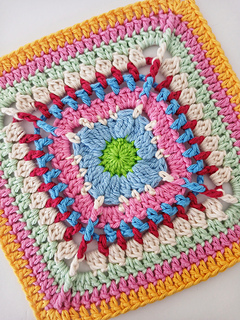 - Finished square using recommended DK/#3 weight yarn and hook size 4mm/G measures 8.5”/22cm