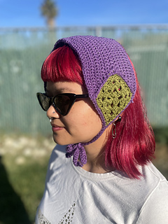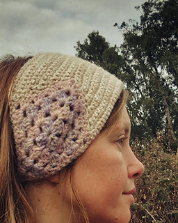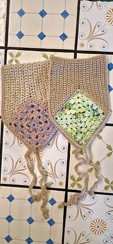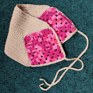 constructed in 3 pieces ( 2 granny squares & the band ) then finished together with a string to tie it