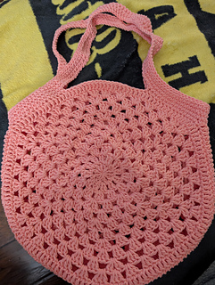 Bag instructions written in sections: Circle Motif (rounds), Tote Bottom (row), Seam (row), Handles (rounds.
