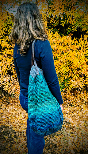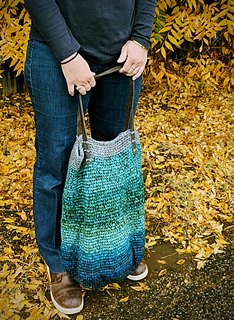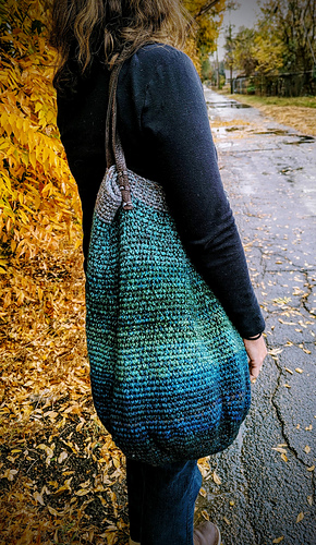 The marled colors flow beautifully as it’s worked from bottom to top, while its simple, tapering bucket shape and size make it roomy enough to hold all the necessities.