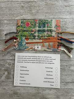 You will need to choose 12 different colours of 100% cotton worsted weight yarn. You will assign each colour to a category/theme for what you are grateful for that day. Each day, you’ll reflect on a simple prompt and add stitches in the colour of yarn that corresponds to the category to mark your gratitude. As the months change, so will the prompts—guiding your reflections and creating a beautiful, personal record of appreciation stitched into your cloth.