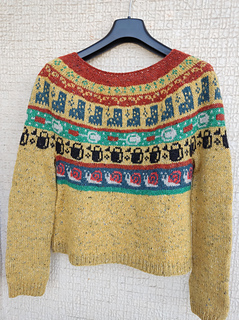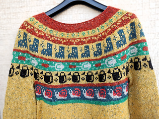 This sweater is worked seamlessly from top to bottom. Starting with a rolled neckline, after completing the yoke, the sleeve stitches are put on hold to work the body from top to bottom. The sleeves are worked in the round from top to bottom down to the cuffs. The edges are worked in 1/1 ribbing.