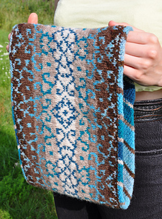 Er wird in zwei Schritten gearbeitet. Zunächst strickt man in Hin- und Rückreihen die Innenseite im Schrägmuster und fügt die kurzen Enden zusammen. Dann werden aus einer Längsseite Maschen für die Außenseite im Fair Isle - Muster aufgenommen und in Runden gestrickt. Abschließend verbindet man Vorder- und Innenseite von außen.