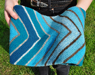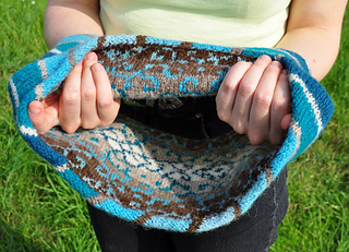 It is knitted in two steps. First, work the inside flat in a bias pattern and join the ends. Then pick up stitches over a long edge and continue to work in rounds according to the chart. Finally, the inside and the outside are joined together.