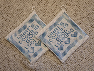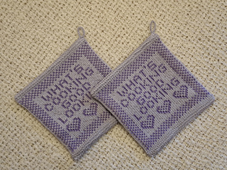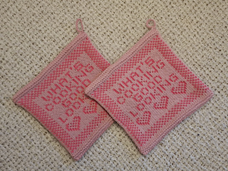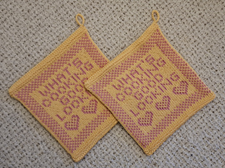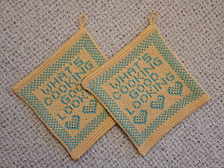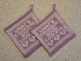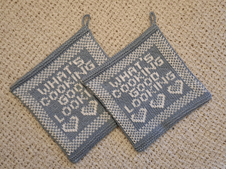 Med 2 nøster av bunnfargen og 1 nøste av mønsterfargen kan du strikke deg disse herlige gryteklutene! Tykke og tette, og i tillegg er de så fine å bli ønsket velkommen av på kjøkkenet.