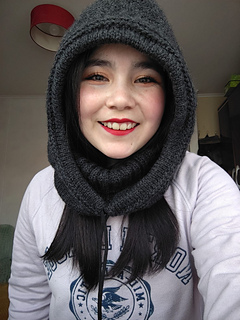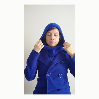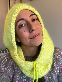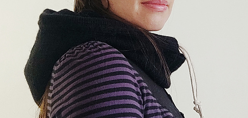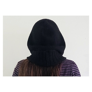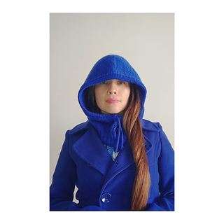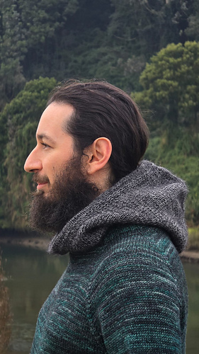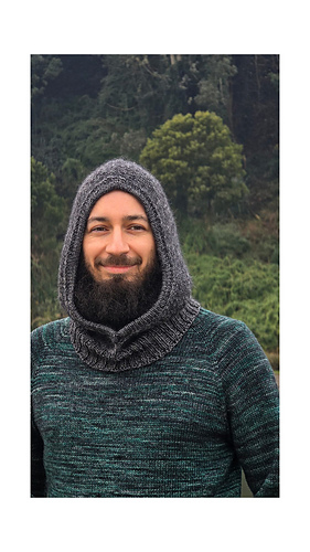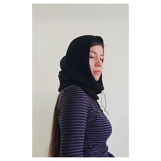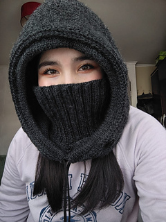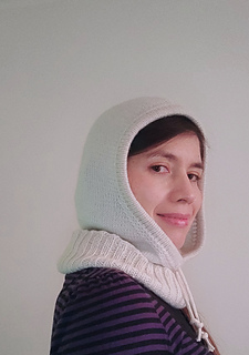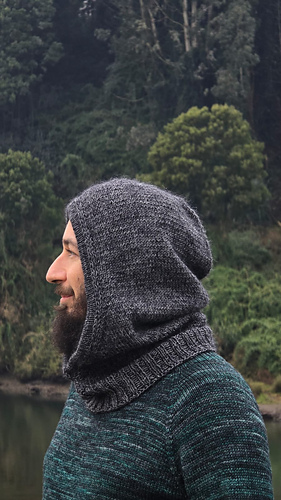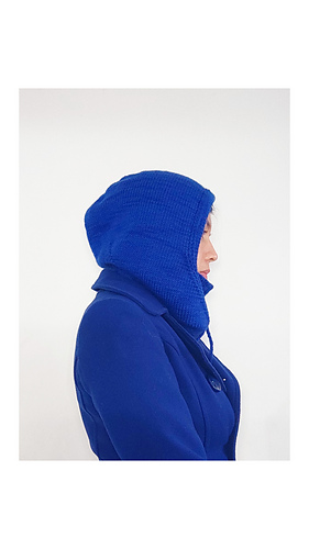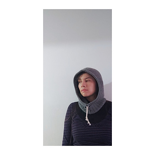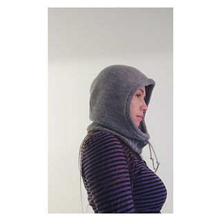 Knitted almost entirely in stockinette stitch, except for its 2 by 2 ribbed collar. Its details include a folded edge for inserting a drawstring or i-cord, allowing for adjustable opening diameter. The bottom features a rounded ribbed collar to support the hood.