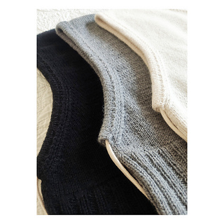 Construction: bottom up (without the ribbed collar), moving from circular knitting to flat knitting. For the crown, German short rows and Kitchener stitch are used. Then, the border edge for the cord and finally, the collar (knitted in the round), allowing the knitter to give it the length they desire or deem appropriate.