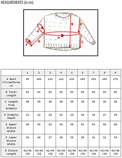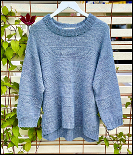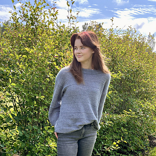 The sweater is knitted top-down with textured stripes. It features dropped shoulders and the shoulder seam is slightly shifted to the back. The back is knitted slightly longer than the front using short rows, so the sweater extends a bit over the bottom. The sleeves can be knitted in three different lengths. The neckline is knitted in rib and folded double.