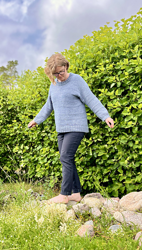 The blue sweater is knitted in Fru Fjellmans Cleopatra DK in the color Blue Steel. The (slightly older) model has a bust measurement of 86 cm / 34 inches and the sweater is knitted in size 3.